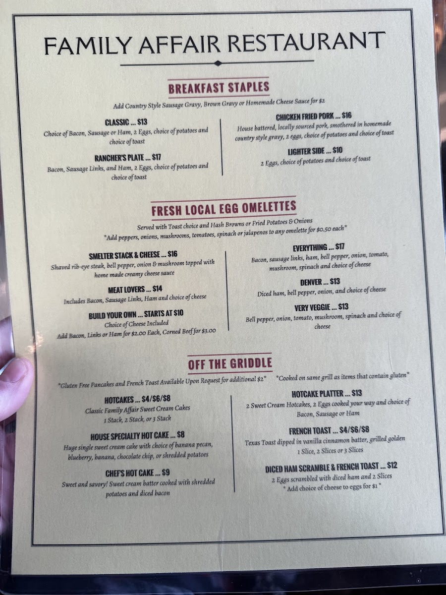 The Family Affair Restaurant offers a straightforward, comforting menu that fits perfectly with its cozy, family-friendly atmosphere. This is a place where classic breakfast favorites and satisfying lunch options are served in generous portions, making it easy to enjoy a relaxed morning meal or a casual midday break.
